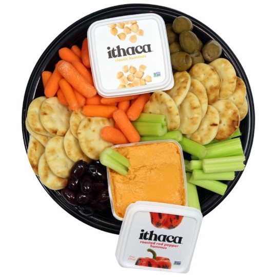 <p>Your choice of two delicious 10 oz. Ithaca Brand Hummus, Delallo Pitted Kalamata olives, Delallo Gigante Olives, carrots, celery and Stonefire Dippers.</p> <p>Serves 8-10.</p>