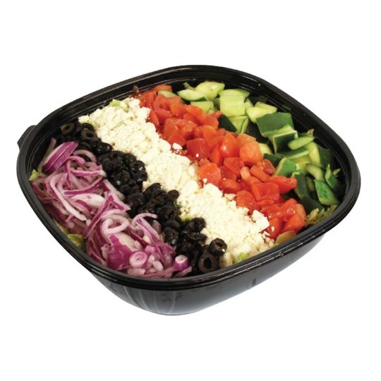 <p>Diced tomatoes, sliced black olives, cucumbers, red onions, Feta cheese, all on a bed of romaine lettuce with a Greek vinaigrette.</p> <p>Serves 12-16.</p>